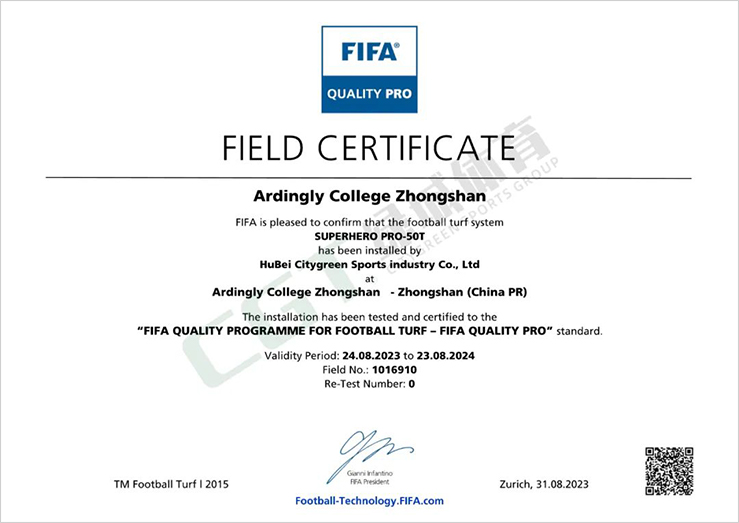 2023年8月,由綠城體育集團股份有限公司(以下簡稱CGT綠城體育)打造的中山阿丁萊學校足球場榮獲國際足聯(lián)FIFA QUALITY PRO認證證書!